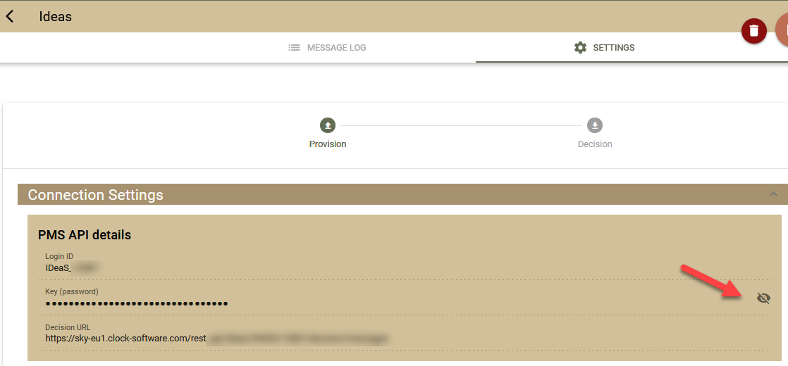 - Ще трябва да предоставите на вашия IDeaS акаунт мениджър потребителското име, API ключа и УРЛ-то на ендпойнта, които ще се използват изпращаните решения. За да ги получите, отидете на страницата Provision settings и ще ги видите в горната част (натиснете бутона, за да разкриете паролата).