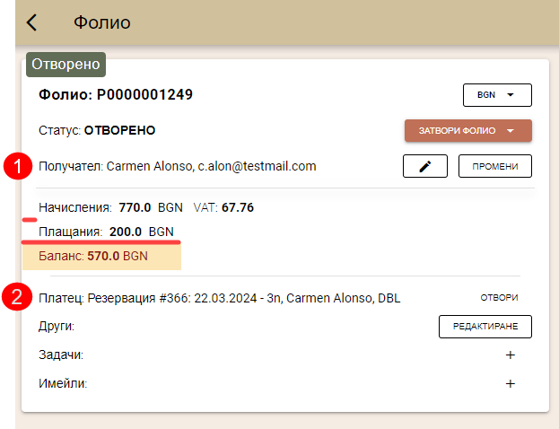 Разглеждайте фолиото като отворената сметка на клиента, в него се начисляват всички предоставени услуги и направени плащания.