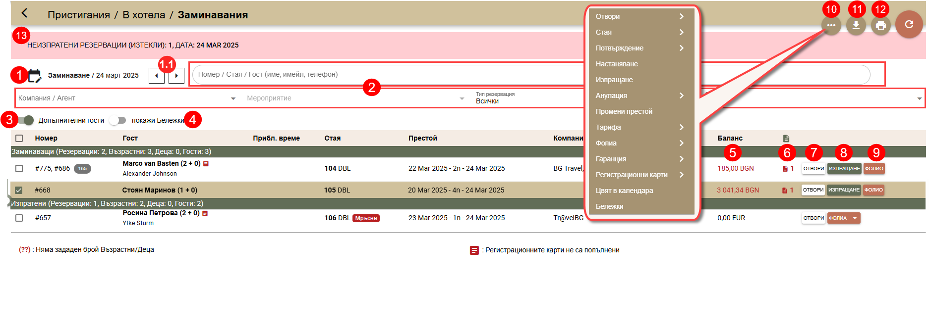 - В реда на всяка резервация виждате текущ баланс (5) (задължения) и брой отворени фолиа (6) на резервацията;