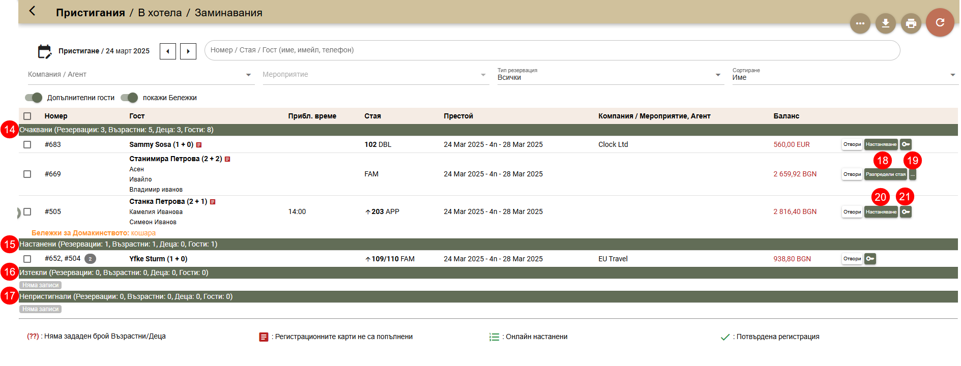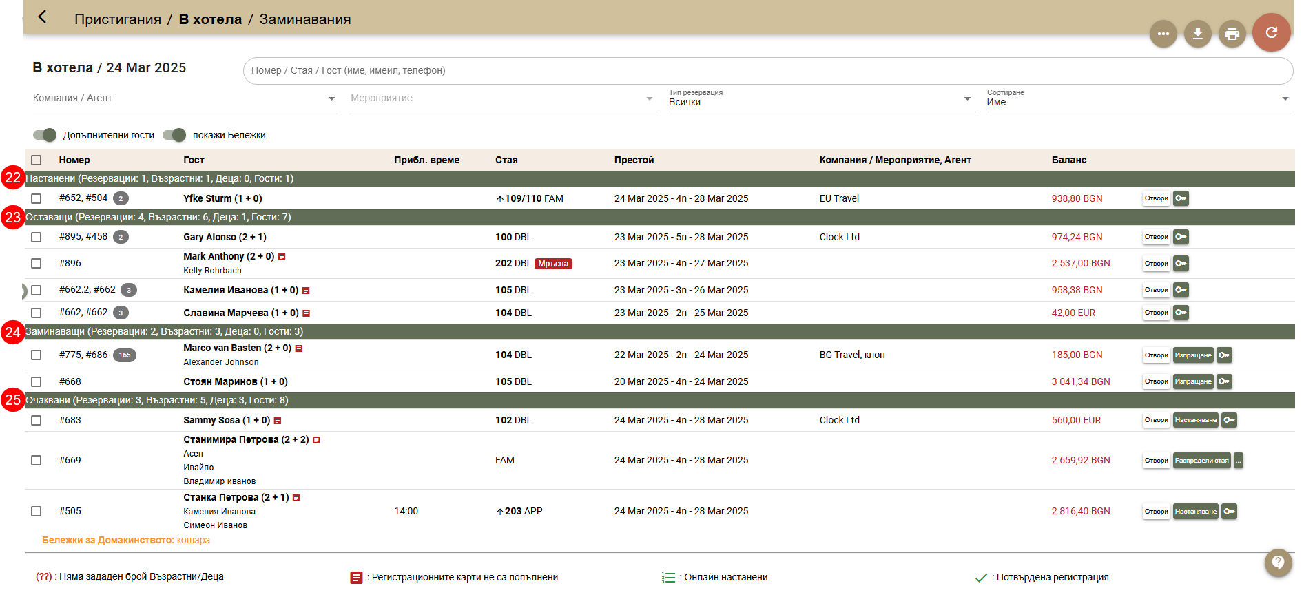 - Всички Настанени (23) от предходни дати, които остават В хотела.
