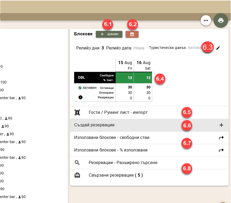 - Можете да създадете резервации, свързани с мероприятието или да изберете от блок чрез бутона "Създай резервации" (6.6)