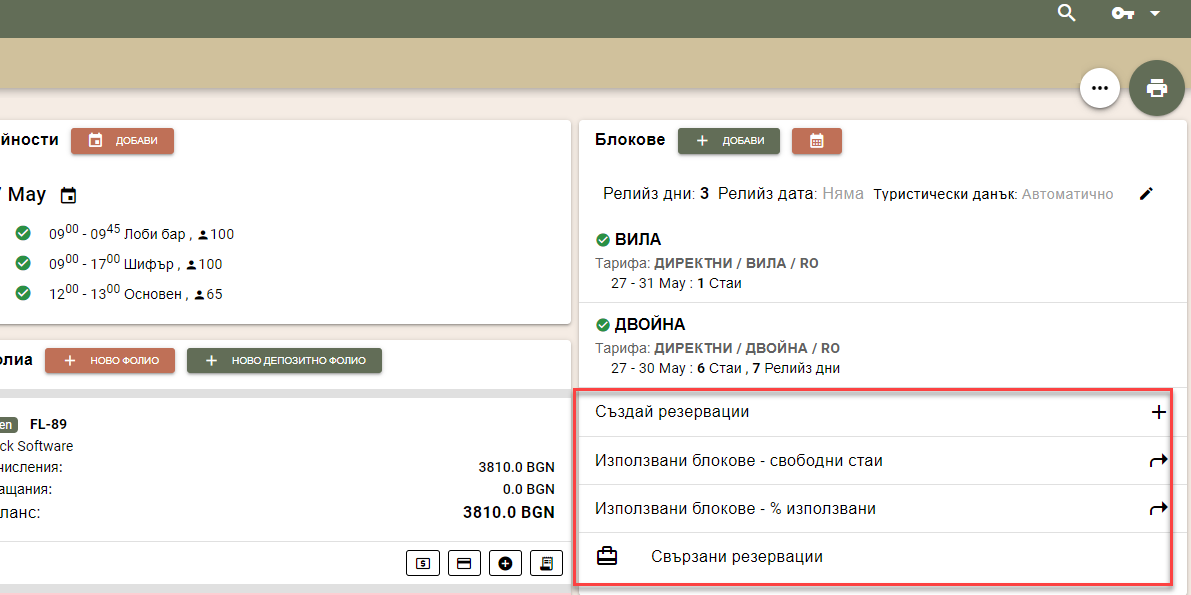 Освен това, имате бързи връзки за отваряне на справка "Използвани блокове" (x2), създаване на резервации или преглед на свързаните с мероприятието резервации на стаи.