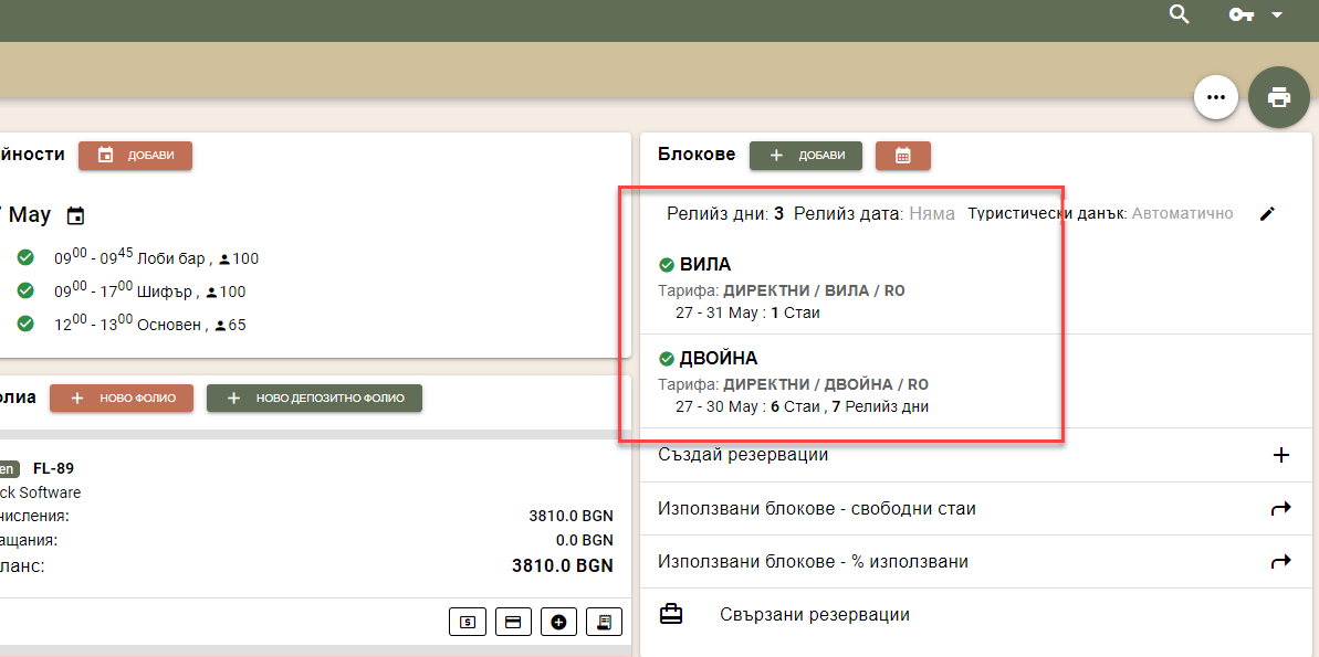 Освен създаване на блок и евентуалното му превръщане в резервация, модулът Блок предоставя и някои по-усъвършенствани функционалности. Независимо кой от трите режима сте използвали за създаване на блок (Цял период, Периоди, Дни), преди да финализирате блока, ще ви се покаже следният екран: