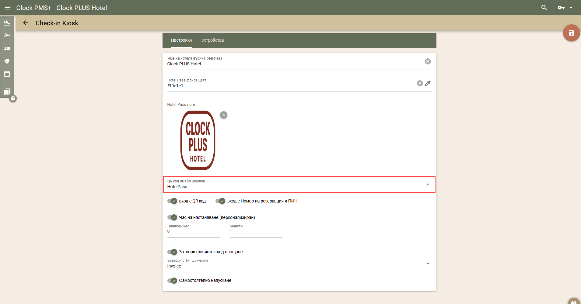 Ако решите да ползвате друг модел таблет или друго устройство, може да изключите опцията "вход с QR код", за да не излиза излишна информация на киоска и да е по-ясно за госта как да се логне (чрез Номер на резервация и ПИН).