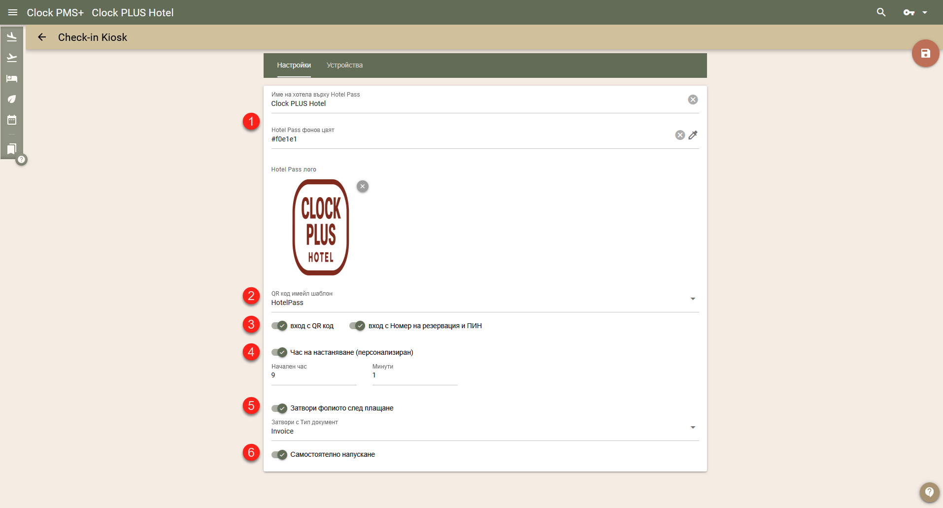 - Вход с QR код/ Вход с Номер на резервация и ПИН (3) - чрез тези настройки, ако ползвате стандартните, препоръчани от нас таблети с вграден QR четец, може да изберете и "вход с Номер на резервация и ПИН" като алтернативен метод за достъп. Така, ако клиентът не е получил или не може да намери QR кода си, ще може да се логне с номера на резервацията си и ПИН-а.