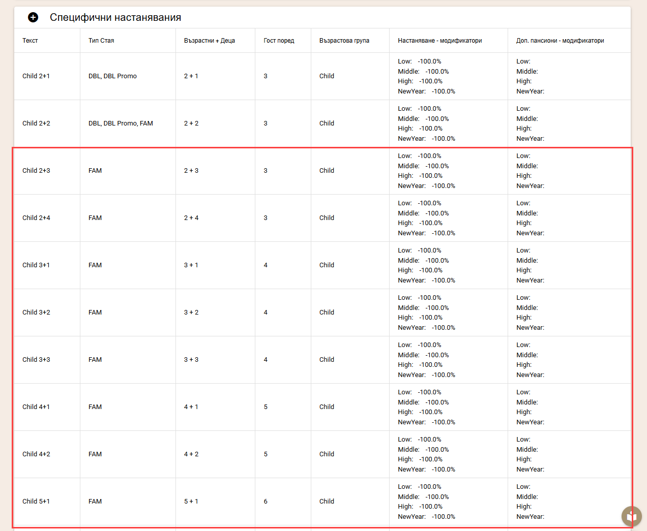 - Настаняване – модификатори → –100% за всички сезони.