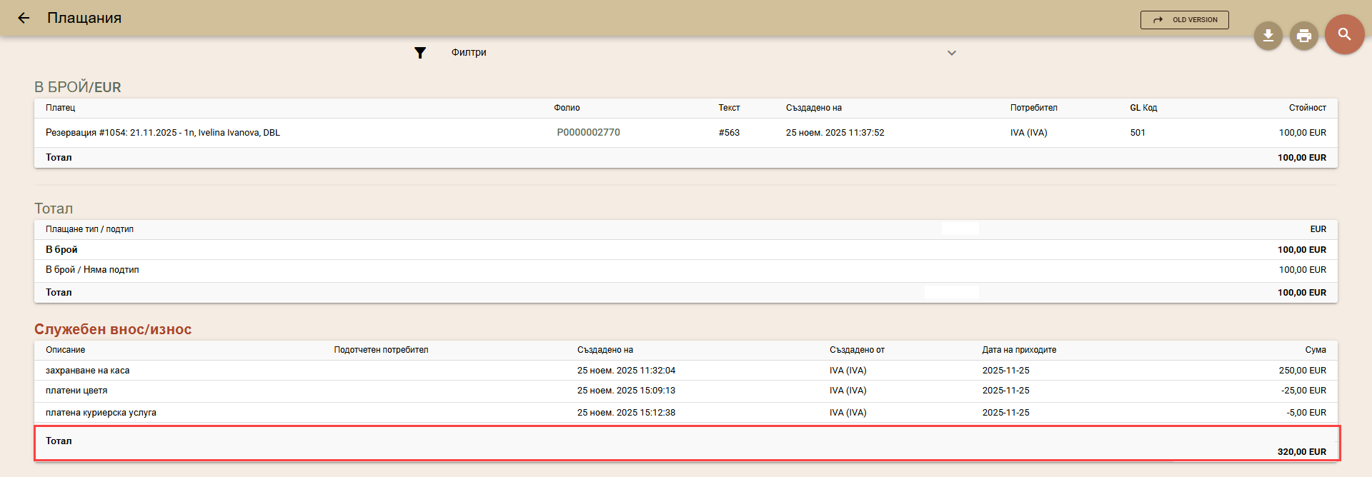 - Обща наличност. Записите от касовия регистър излизат в справката "Плащания", отчитайки филтрите за период и потребител. Записите са добавени накрая на справката, като е добавен и общ тотал по валути. Общият тотал включва касовите плащания по фолиата + касовия регистър.