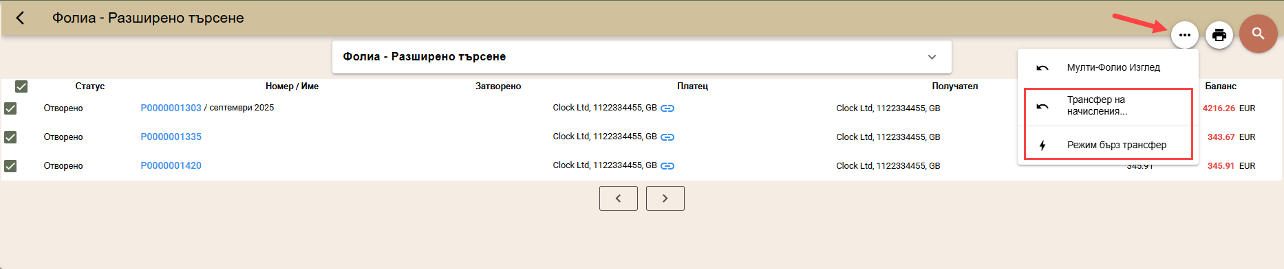 - От екрана Разширено търсене на фолиа – филтрирайте фолиата по желаните критерии, изберете фолиата, щракнете бутона с точките (...) и изберете "Трансфер на начисления". Изберете опциите в екрана и потвърдете. Алтернативно, от бутона с точките (...) може да изберете "Режим бърз трансфер". Това ще покаже бутон "Прехвърли всички начисления тук", който ще отвори екрана за трансфериране на начисления.