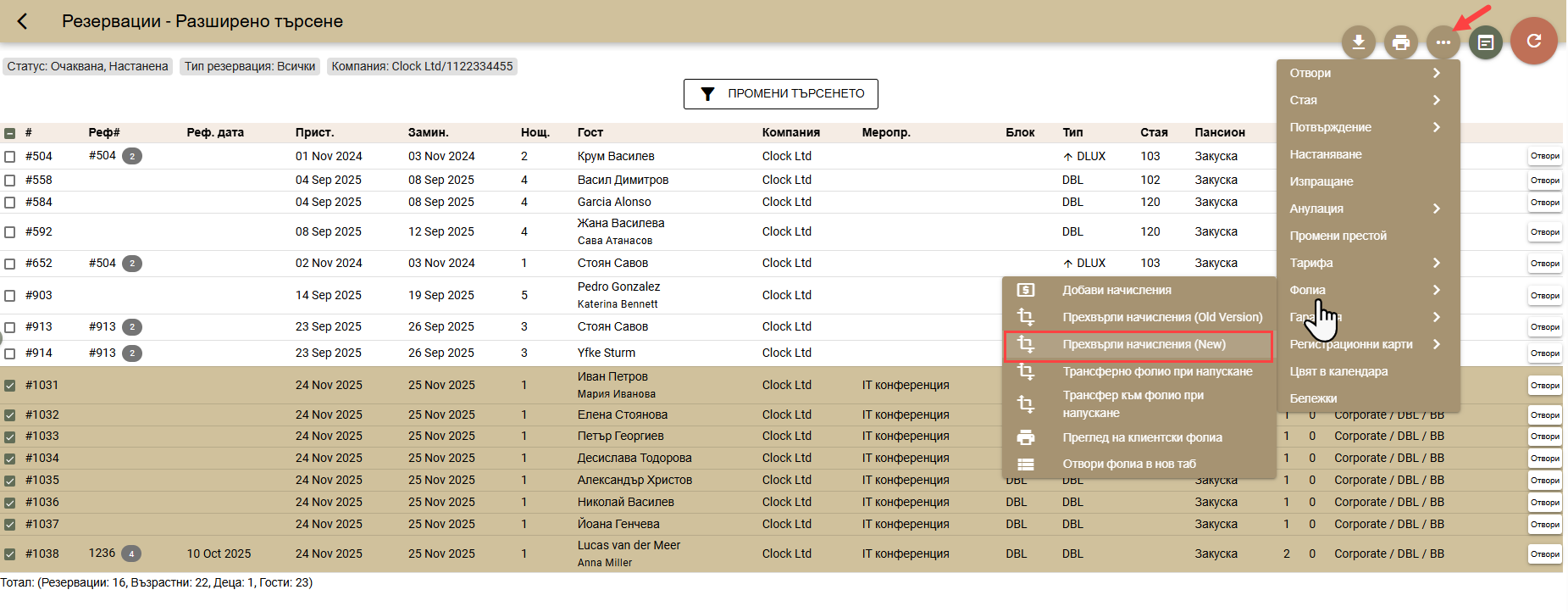 Добавихме нова, подобрена функция Трансфера на начисления към търсенията на резервациите (пристигащи, заминаващи, в хотела, разширено търсене), както и към Разширеното търсене на фолиата. Чрез нея може с няколко клика да трансферирате начисления от множество фолиа към едно фолио.