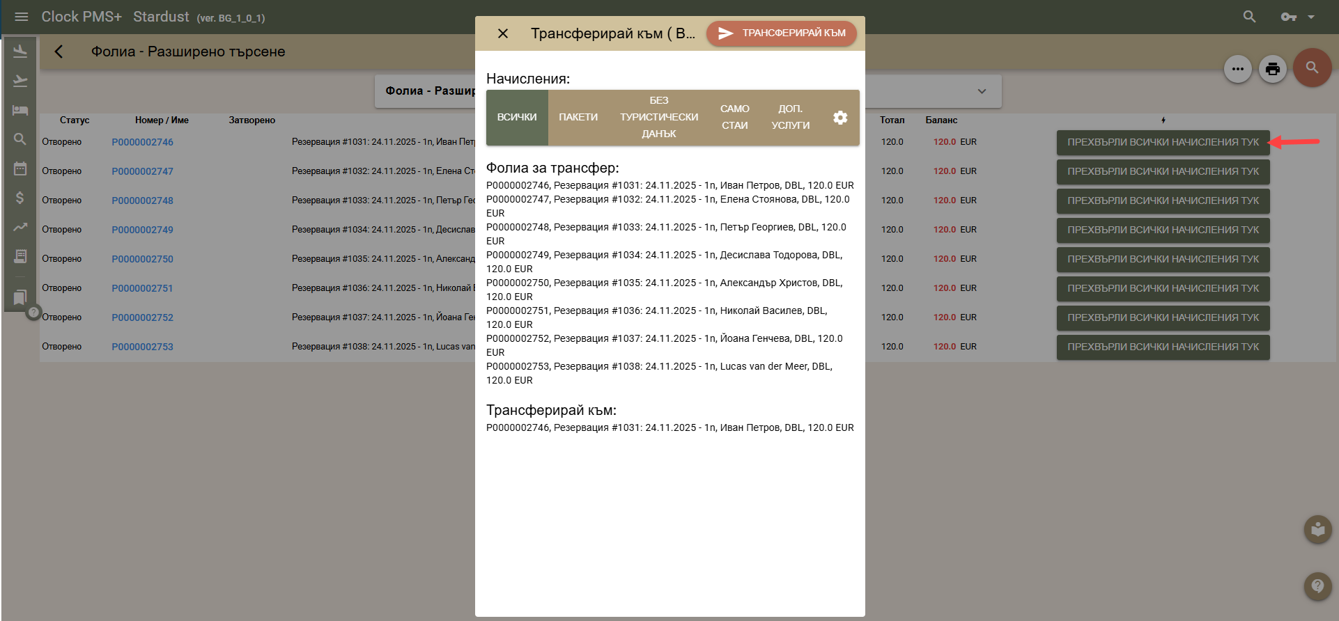 - От екраните с търсенията на резервации – изберете бутона с точките (...) →Фолиа →Прехвърли начисления (New). След това кликнете "Прехвърли всички начисления тук" за фолиото, в което желаете да трансферирате. Ще се появи екран, в който да изберете дали желаете всички начисления да се трансферират или определен тип – може да ползвате бързите опции: Всички, Пакети, Без туристически данък, Само стаи, Доп. Услуги или да изберете конкретните приходни групи.