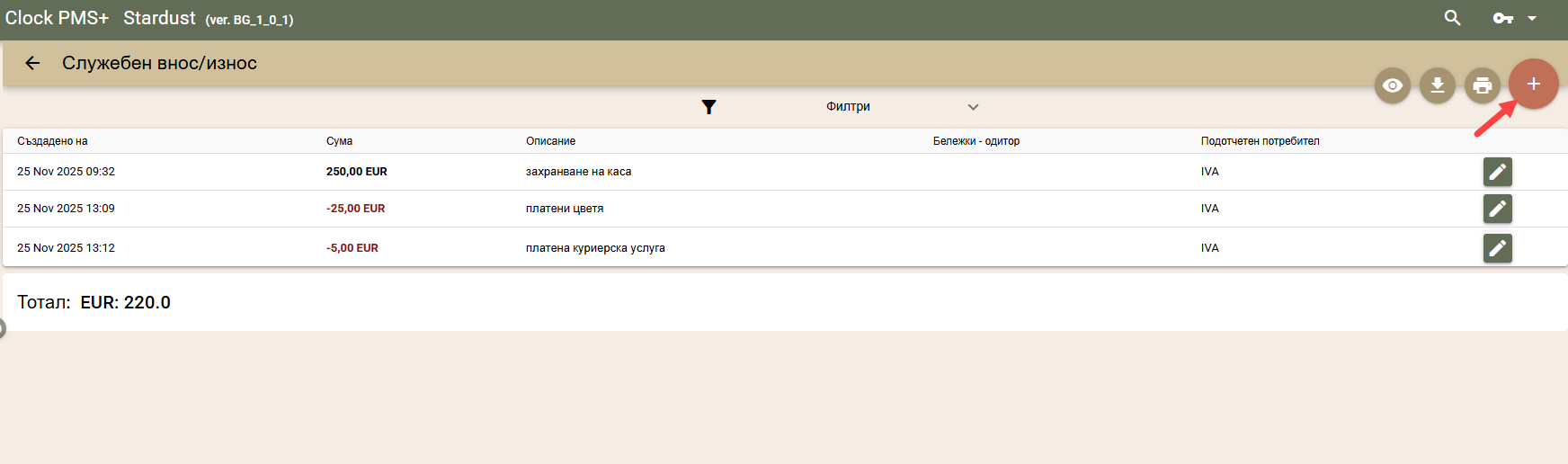 Добавихме нова функционалност, чрез която да можете да следите служебните касови потоци и общата касова наличност. До момента в системата се проследяваше паричния поток, свързан само с плащанията на клиентите. Потоците, свързани със служебен внос и износ, не се проследяваха директно, а обходното решение с плащания във външно фолио не беше ясно и създаваше объркване. Новата функционалност е насочена към изричен регистър за подобни движения. Ето описание: