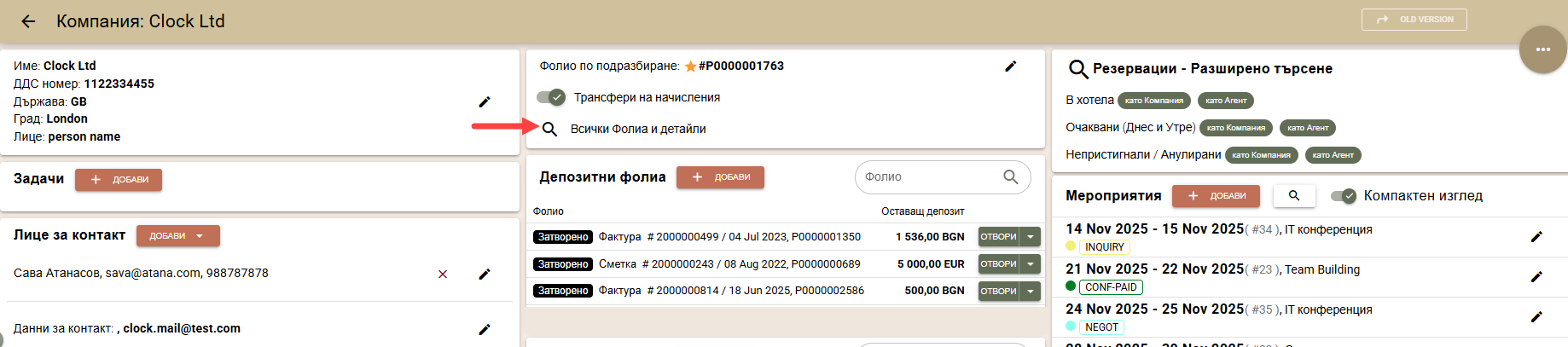 - Фолиа. По подобие на стария екран може да видите всички оперативни фолиа на едно място – неконсумирани аванси, отворени фолиа и затворени неплатени фолиа. Чрез връзка към новото “Разширено търсене на фолиа” може да намерите всяко фолио, свързано с тази компания, по още повече критерии от преди.
