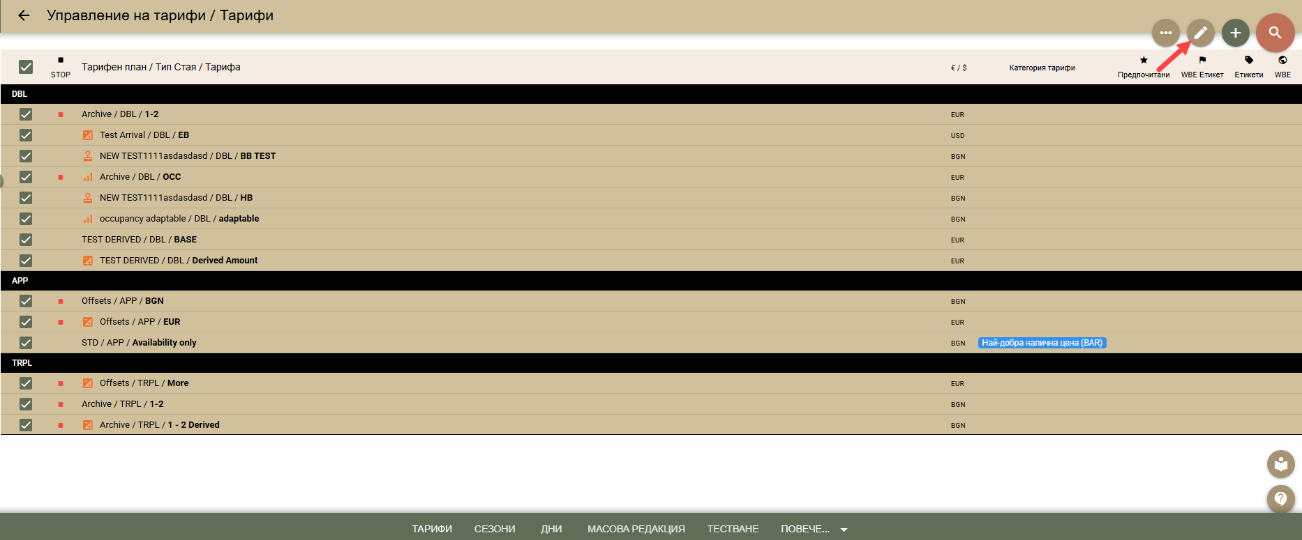 - Селектирайте всички тарифи от списъка и изберете бутона за редакция;