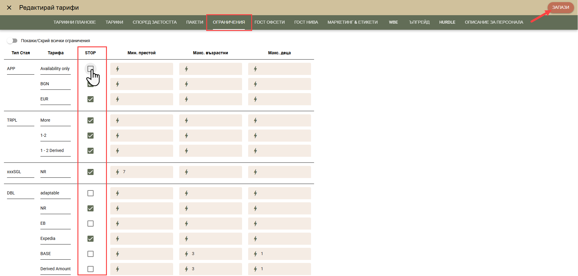 - Преминете в таб "Ограничения" и задайте STOP на всяка тарифа;