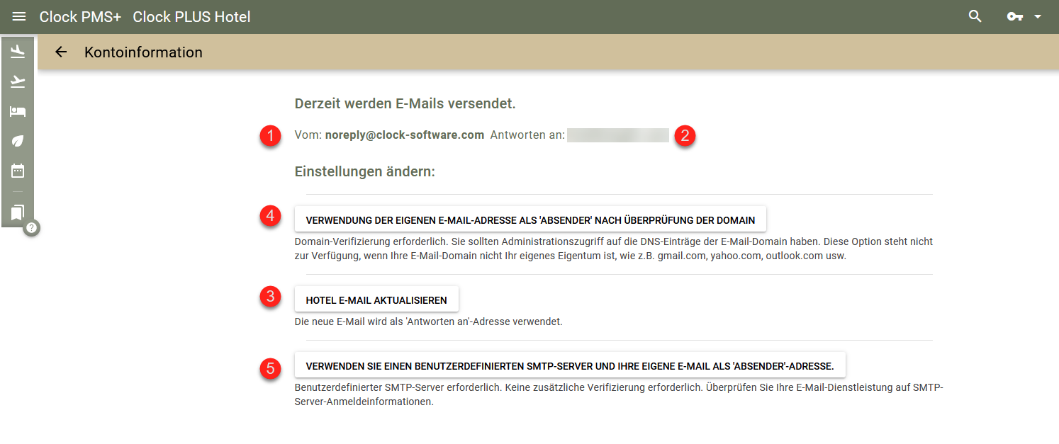- Hotel E-Mail aktualisieren (3) - verwenden Sie diese Option, wenn Sie die 'Antwort an'-Adresse ändern möchten. Die 'Von'-Adresse lautet weiterhin noreply@clock-......