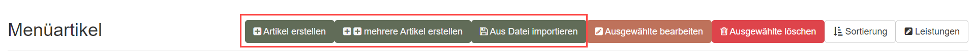 Um Ihre Menüartikel in Clock POS einzurichten, gehen Sie zu Verwaltung -> Menüartikel. Auf diesem Bildschirm finden Sie drei verschiedene Optionen zum Hinzufügen Ihrer Menüartikel: