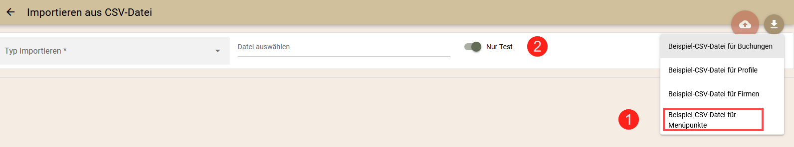 Sie haben die Möglichkeit, einen Massenimport von Menüartikeln über eine Importdatei durchzuführen. Klicken Sie dazu auf die Schaltfläche 'Aus Datei importieren'. Auf dem nächsten Bildschirm können Sie die Beispieldatei (1) herunterladen und die Beispieldaten durch Ihre Daten ersetzen.