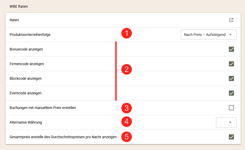 - Sortierung der Produkte (1) - wählen Sie, wie die Produkte in der WBE sortiert werden sollen. Sie können aus 3 Optionen wählen: Preise aufsteigend - die Preise werden von den niedrigsten zu den höchsten sortiert; Preise absteigend - die Preise werden von den höchsten zu den niedrigsten sortiert; Raten-Sortierung - verwenden Sie eine benutzerdefinierte Sortierung, um Raten und Zimmer nach Ihren Wünschen zu sortieren.
