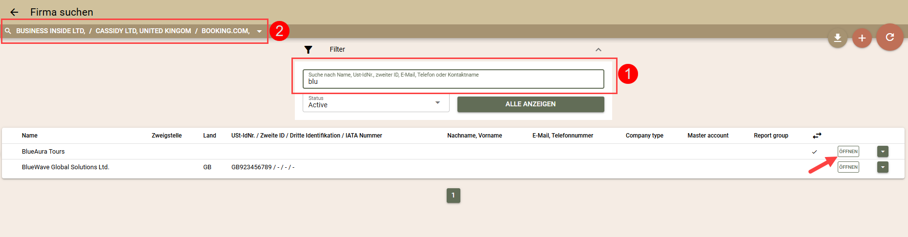Um eine bestehende Firma zu öffnen, navigieren Sie zum Menü Firmen->Firma suchen (new) -> Geben Sie den Namen, die Ust-IdNr. oder die Kontaktdaten (1) ein, und das System zeigt die Firmen, die Ihrer Suche entsprechen, auf der Ansicht an. Um das Profil zur Ansicht zu öffnen, klicken Sie auf die Schaltfläche „Öffnen“ in der Zeile des gewünschten Unternehmens.