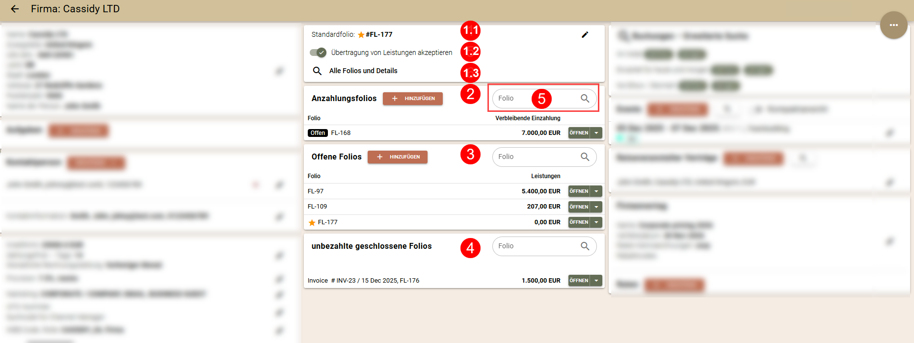 - Offene Folios (3) - Sie können ein neues offenes Folio erstellen oder alle aktuellen offenen Folios im Profil dieser Firma einsehen.
