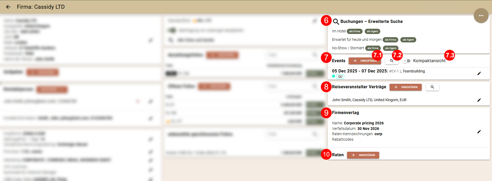- Events (7) – In diesem Abschnitt sehen Sie unternehmensbezogene Events, die als Links aufgelistet sind, über die Sie schnell darauf zugreifen können. Der Schwerpunkt liegt auf aktuellen und bevorstehenden Events, die übrigen finden Sie über den Link zur Event-Suche (7.2). Neben jedem Event zeigt Clock den Zeitraum des Events und die Anzahl der damit verbundenen Buchungen an. Dies ist gleichzeitig ein Link zu einem erweiterten Suchbildschirm, auf dem diese Buchungen in einer Detailansicht angezeigt werden. Darüber hinaus können Sie auch ein neues Event im Zusammenhang mit dieser Firma erstellen (durch Klicken auf die Schaltfläche „+Hinzufügen“ (7.1)). Die Events-Liste verfügt auch über eine kompaktere Ansicht (7.3), die Sie über die Schaltfläche oben aktivieren können.