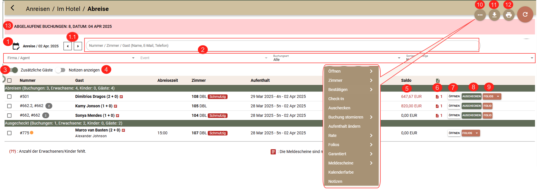 - Wenn es unbearbeitete Abreisen von früheren Daten gibt, sehen Sie im oberen Teil des Bildschirms einen Zugang link (13) zu der Liste dieser Buchungen.