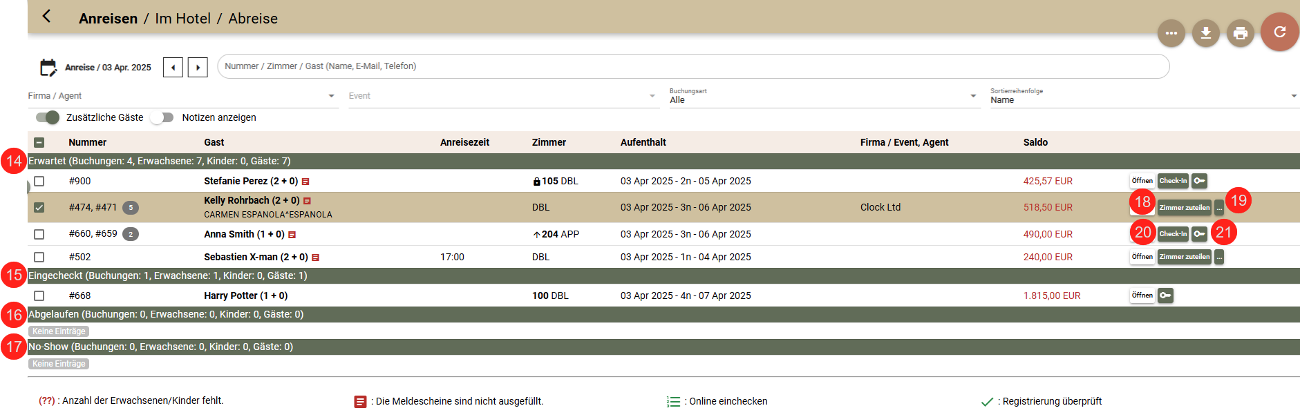 - Erwartet (14) für das Datum - Buchung noch nicht eingecheckt;
