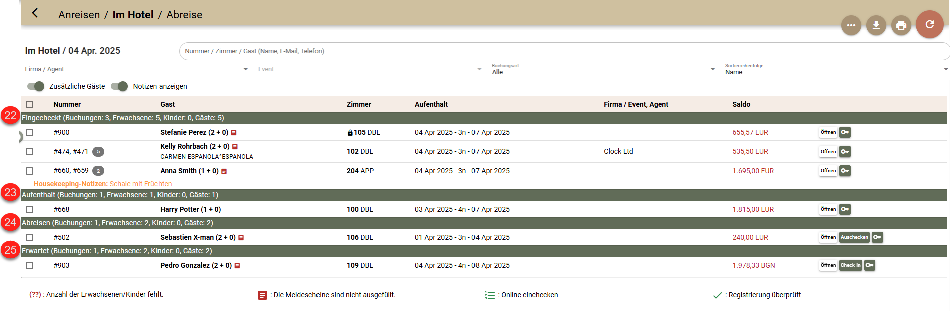 - Alle Eingecheckt (23) aus den vorherigen Daten, die im Hotel verbleiben.