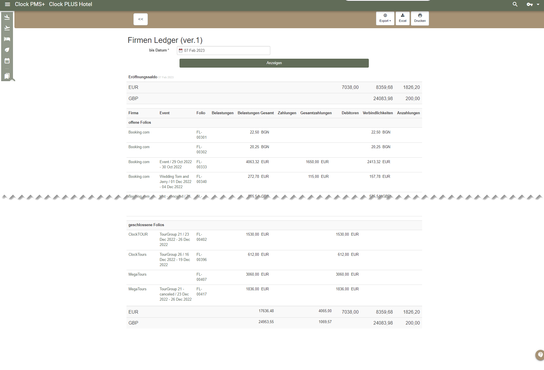 Es enthält Daten von normalen Firmen und Event Folios. Es werden nur die unausgeglichenen Folios angezeigt bzw. die Folios, bei denen ab dem Datum des Berichts eine Bewegung stattgefunden hat. Die Folios sind in zwei Gruppen unterteilt: offene und geschlossene Folios. Die Berichtsspalten sind mit denen des Gast Ledgers identisch und werden auf die oben beschriebene Weise berechnet.