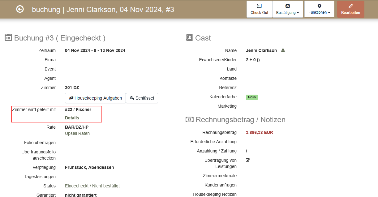 Wiederholen Sie die Schritte für alle Buchungen, die Sie demselben Zimmer zuteilen möchten. In den Details der einzelnen Buchungen sehen Sie die Informationen über die gemeinsame Nutzung des Zimmers und die Details der übrigen Buchungen.