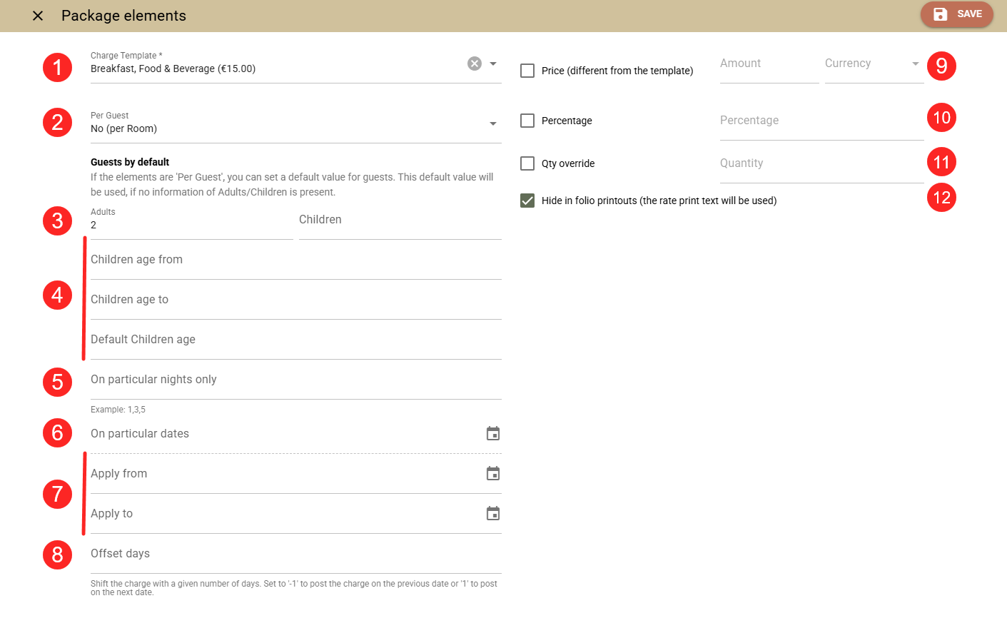 • Percentage (10) - if selected, it will override the price of the charge template with a % amount based on the total rate price for this package only.