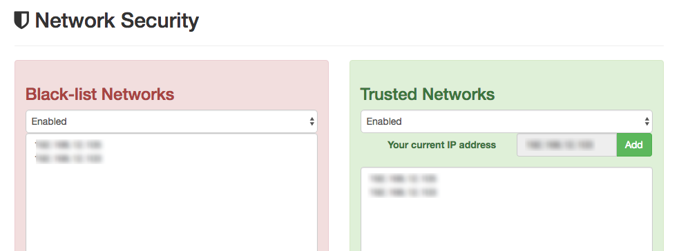 - Go to 'Settings' - 'Network Security'. Enter the Trusted Networks list. Use CIDR format for the IP addresses and networks (please, consult your network administrator). Click 'Enable' to activate the function.