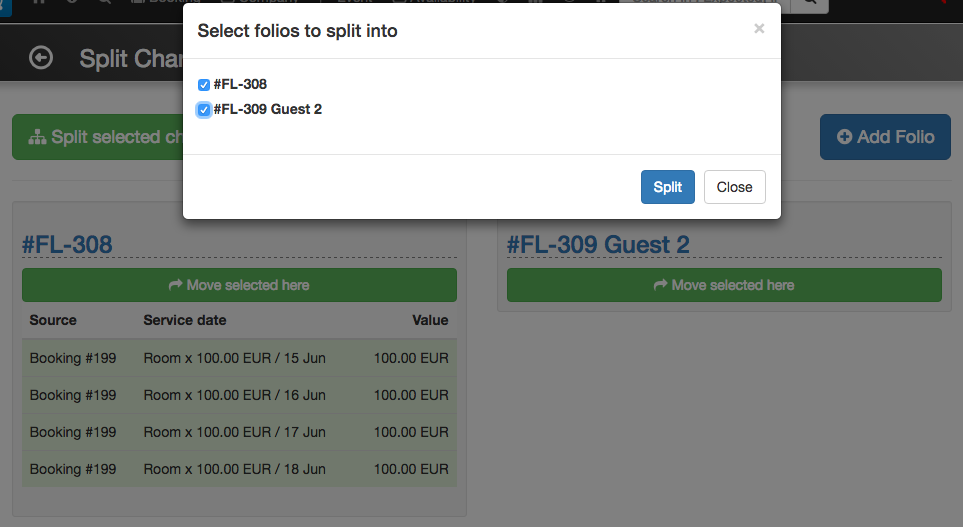 - Split: Select the charges you need to split between the parties. Click 'Split the selected charges'. Select the folios where these charges will be paid. The charges will be split equally and transferred to the folios.
