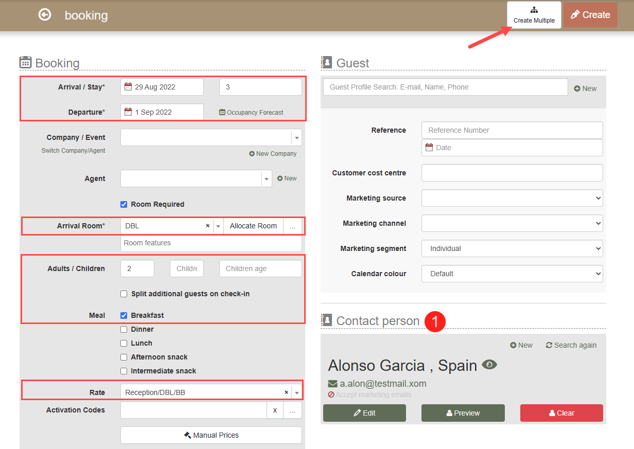 Note: If you don't fill in the Guest in the booking, but only the Contact person (1), the system will create new profiles (without names) of the main guests for each booking in the group. Later on these profiles can be updated with the actual names of the guests.