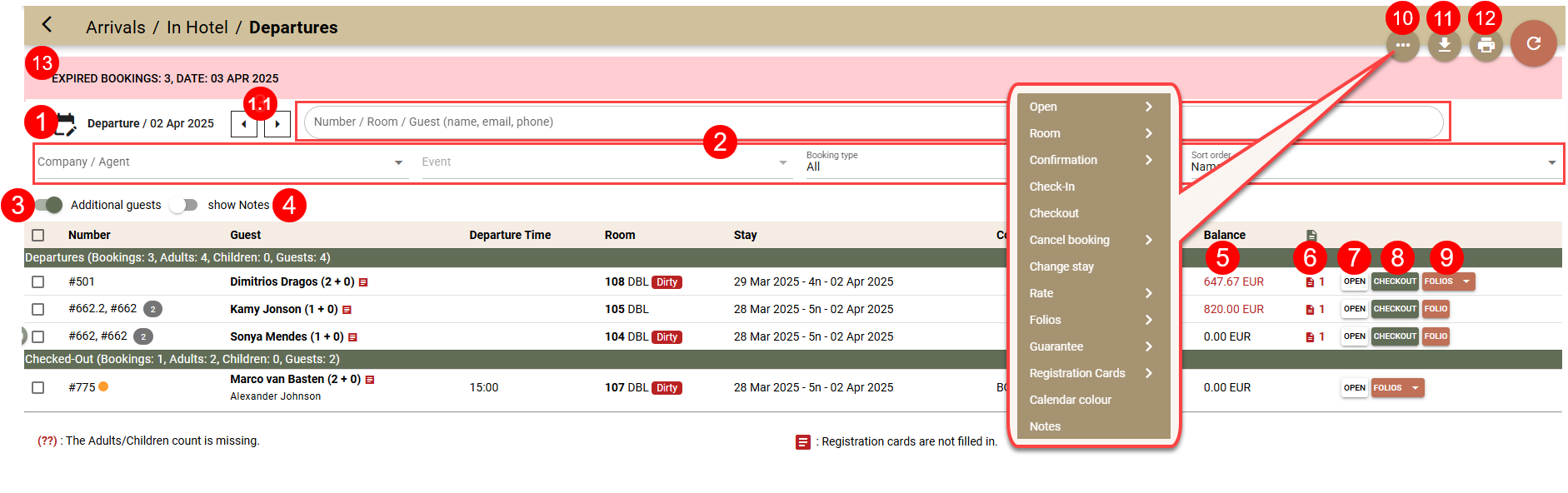 The bookings are divided into two groups - Departures and already Checked-Out. Here are the screen's options: