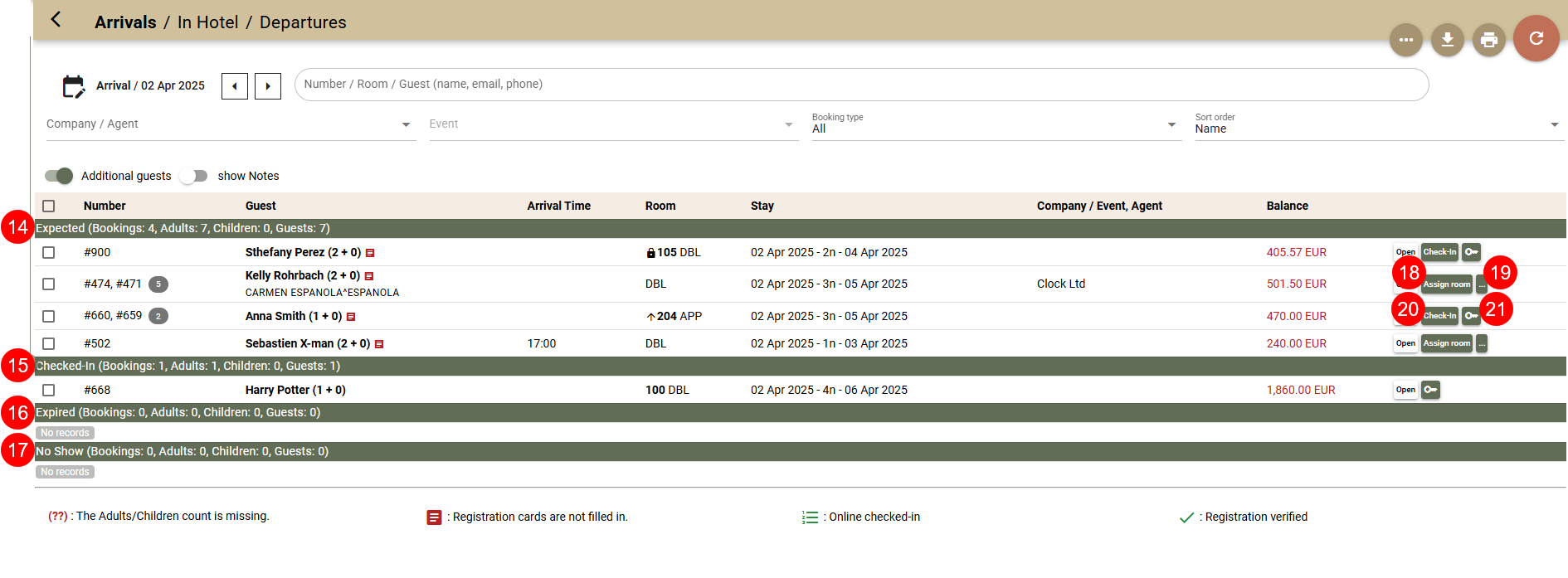 - Expected(14) for the date - booking not checked in yet;