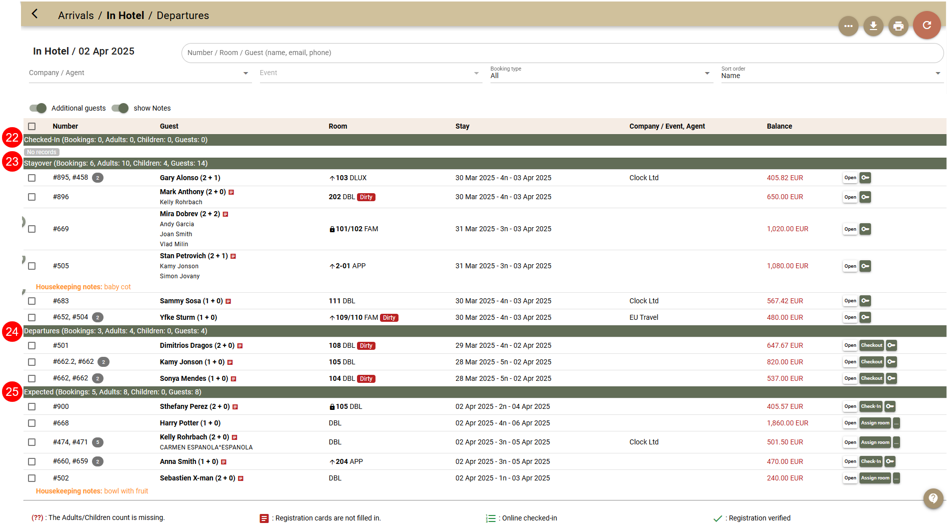 - All Checked-in (23) from the previous dates remaining in the hotel.