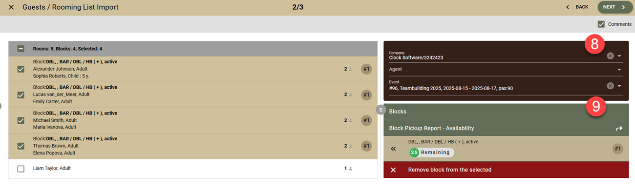 At this step, you will define the Company, Agent, Event (8) and Blocks (9) to which the bookings are related. If you started the process from a specific Event, this data is already filled in. If the event has blocks, you can choose which rooms belong to which block.