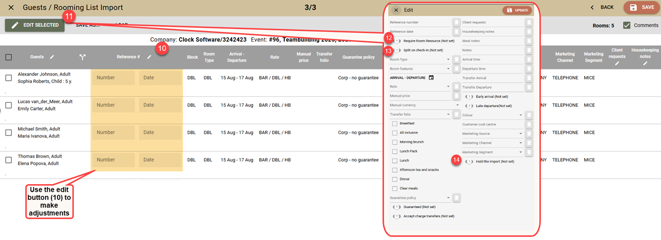 In the booking table, in the header, you will notice that for certain columns there is an edit button (10). If you select it, you will be able to fill in the data for the guests or booking directly in the table.