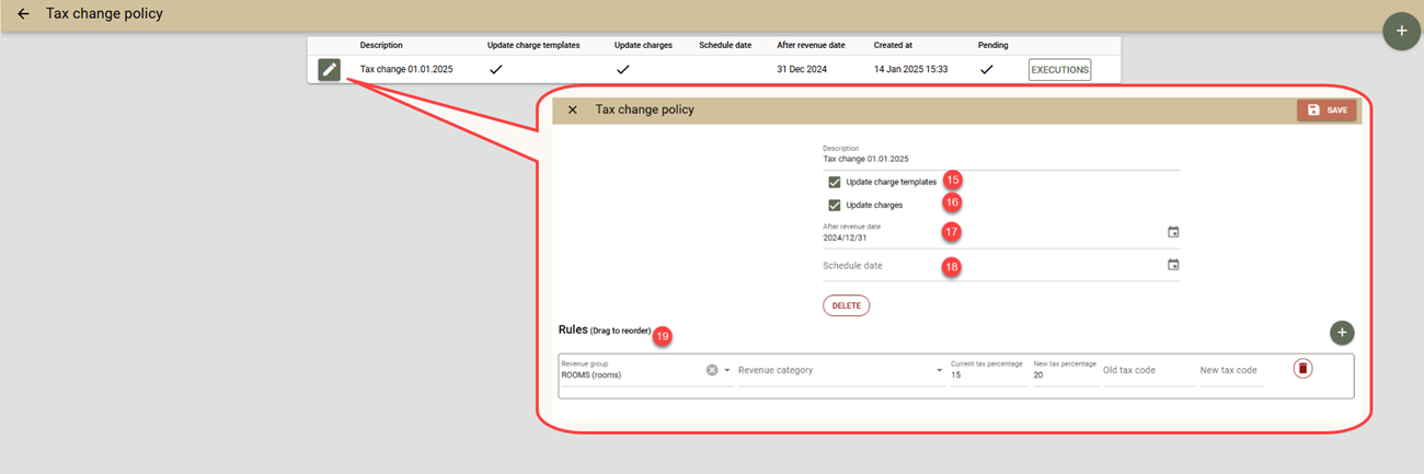 - Add the rules (19) to be executed. For each rule, fill in - which revenue group it relates to and possibly which category. Also fill in the current tax rate and the new tax rate.