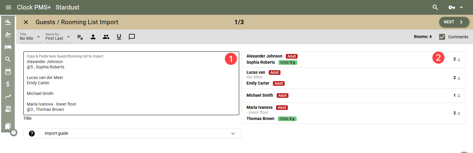 Getting started is simple. Open the file containing the Guest/Rooming list you received from your partner, copy its contents, and paste them into the field on the left (1).