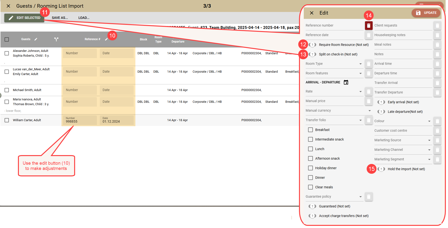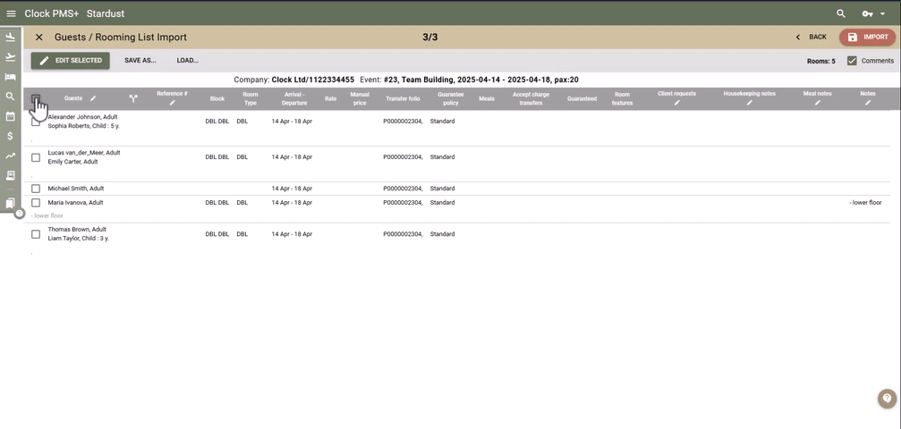All specified or missed data here can be filled in at the last step. Once you have finished processing the list and allocating guests to rooms, proceed to the next step.
