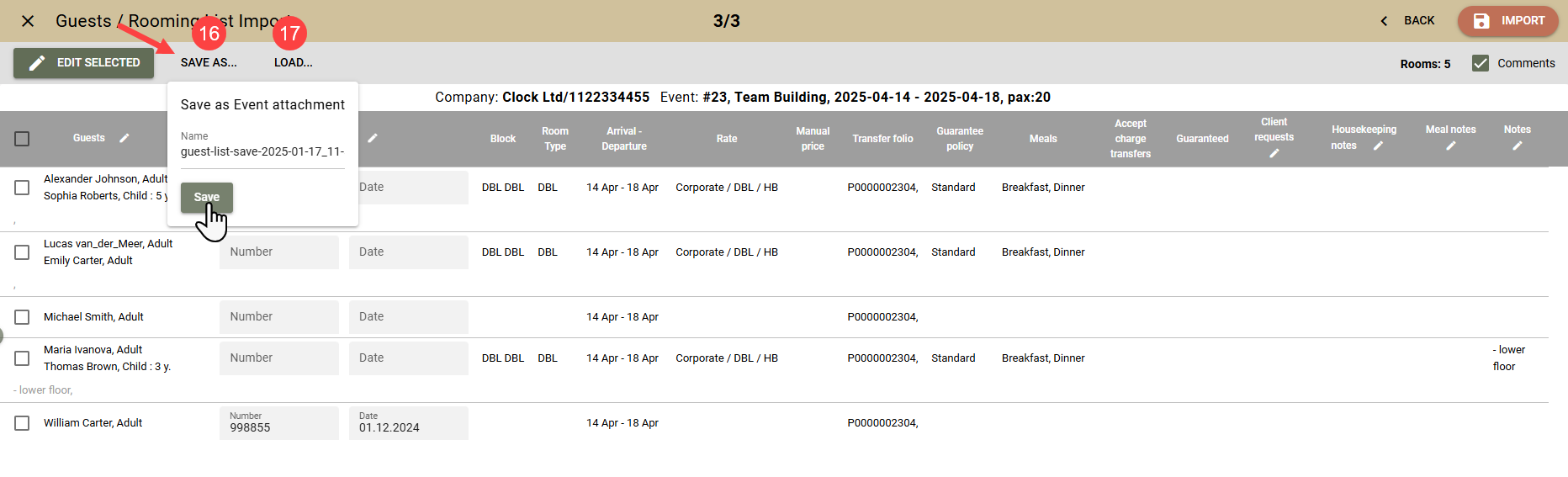 - To load the saved Rooming List, open the "Guests / Rooming List Import" screen through the Event, proceed to step 3, and select the "Load.." (17) button. Select the file from the list and confirm.