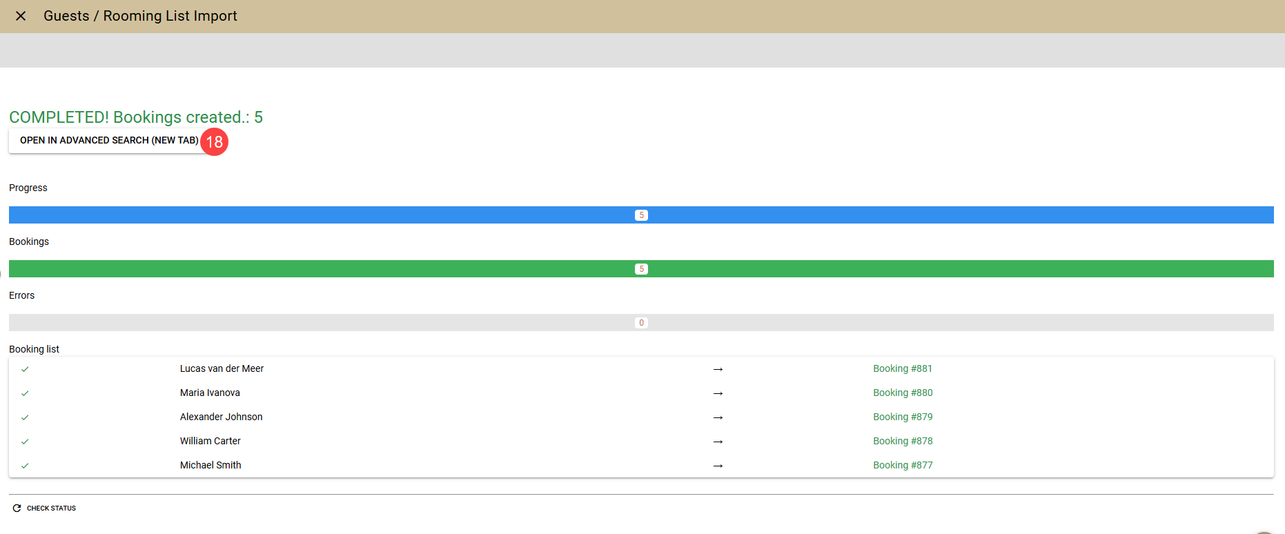 You can see in real-time how the processing of the Rooming List and the creation of reservations is progressing. The system will create reservations for all rooms for which the necessary data has been filled in. Any import errors that occur will be displayed on the screen. Once the process is complete, the system will display statistics on the number of processed rooms, created reservations, and any errors that occurred. Use the "Open in Advanced search" (18) button, to access the list of newly created reservations.