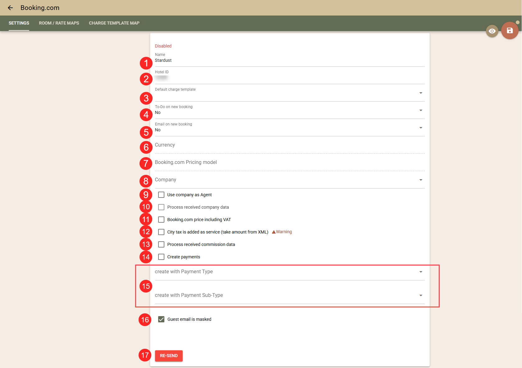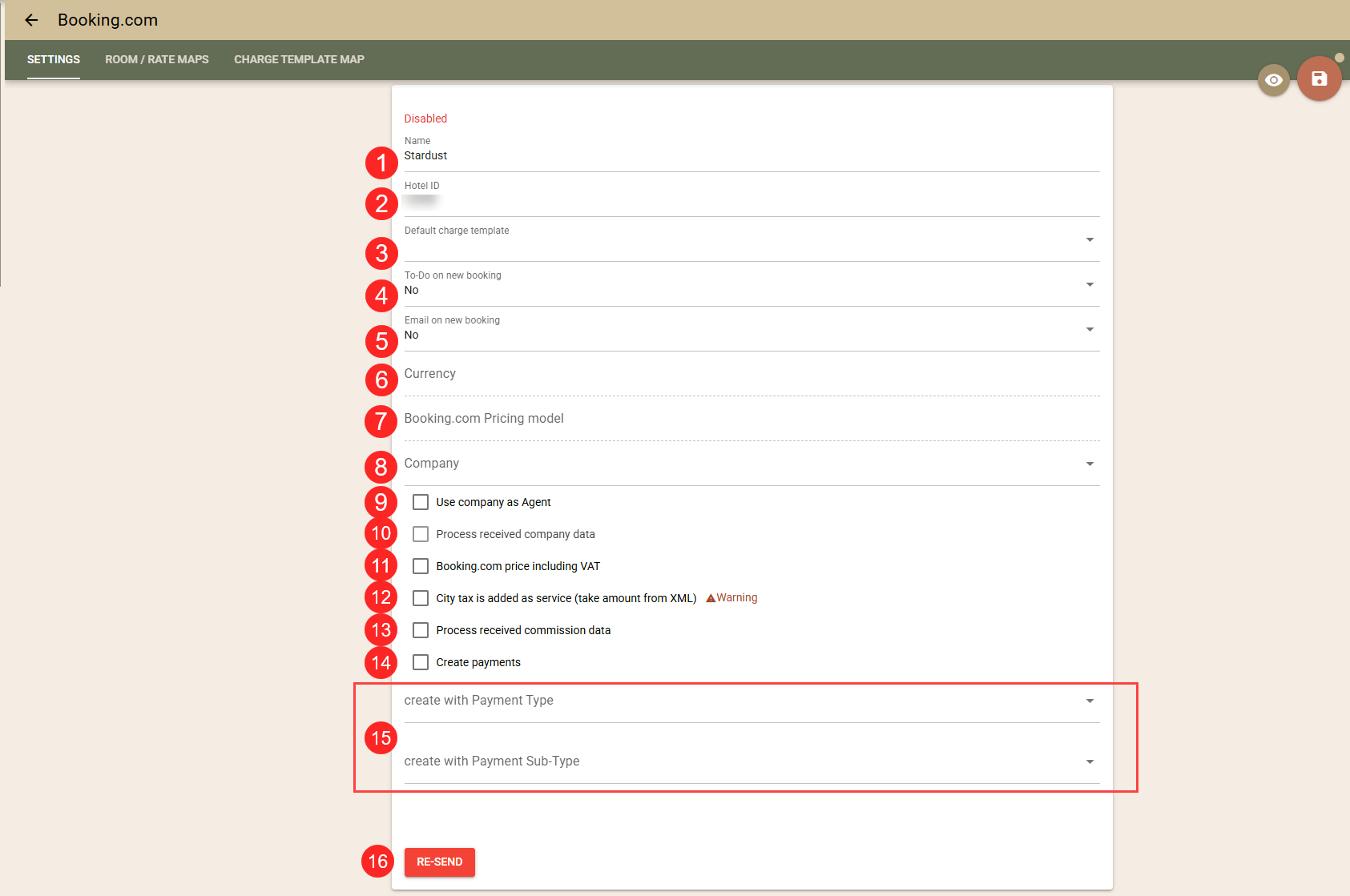 - Re-send (16) - Allows scheduling a manual full update of availability, prices, or restrictions. Use only when requested by Clock or Booking.com support.