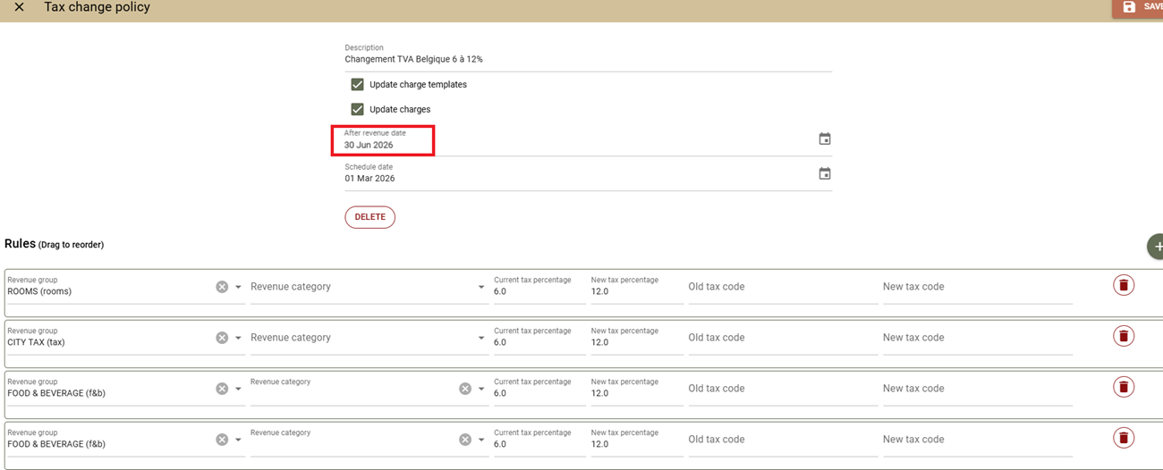 Before making such changes, we strongly advise confirming with the Belgian VAT authorities whether VAT should remain 6% or change to 12%, depending on the new stay dates.