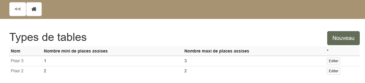 - Nom : Selon les meilleures pratiques, le nom du type de table doit indiquer le nombre de clients pouvant s'asseoir à ce type de tables.