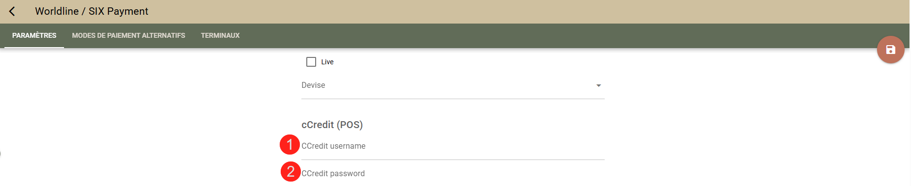 - cCredit password (2) - entrez le mot de passe cCredit qui vous a été fourni par Worldline/Six pour l'intégration avec Clock PMS+.