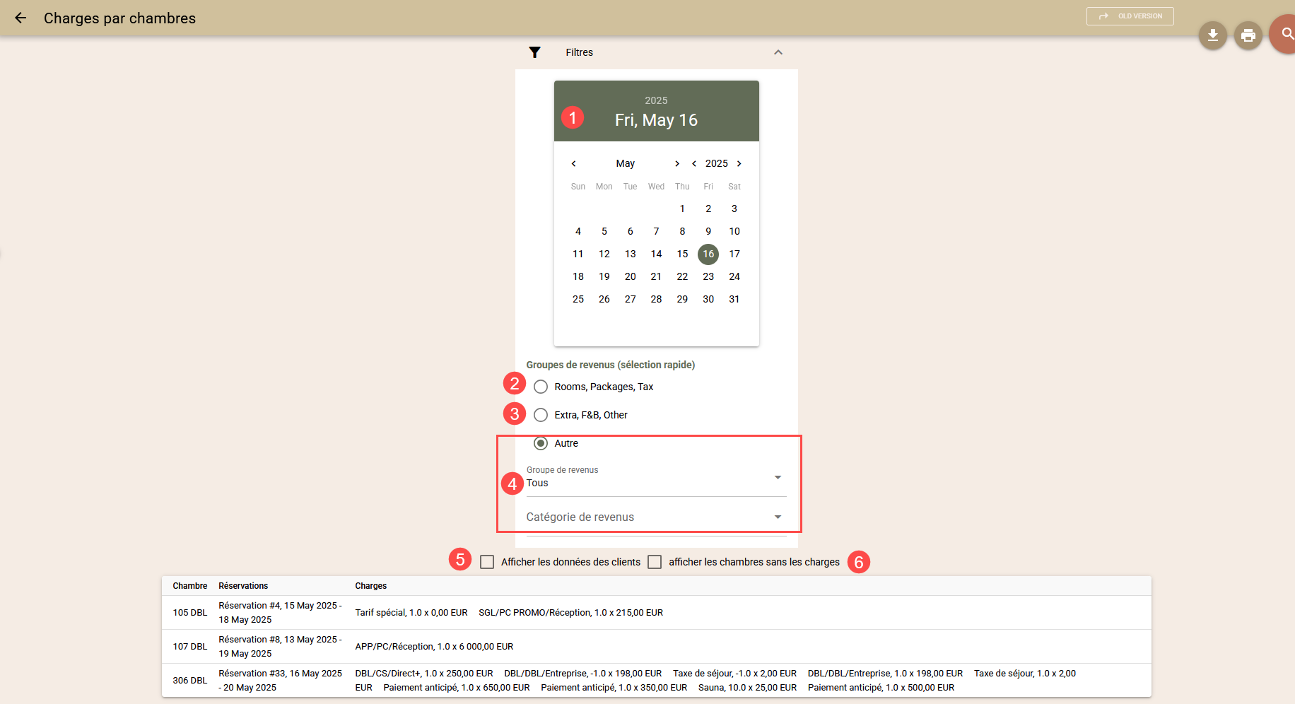 Les deux cases à cocher situées sous les filtres vous permettent d'étendre le rapport en incluant des informations sur les noms des clients (5) et les chambres sans frais (6) pour la date sélectionnée.