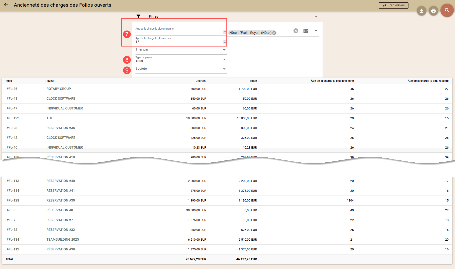 - Type de payeur (8) - génère des listes distinctes de folios en fonction de leur type de payeur - Réservations, Sociétés ou Événements ;